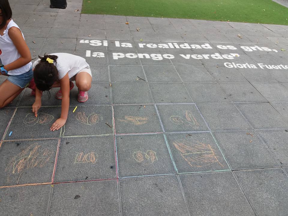 Dibujaremos una rayuela en el suelo. Propondremos una manera de jugar en la que a cada número le corresponderá una acción a realizar dentro de la feria. Por ejemplo, encontrar un libro, leer un fragmento en alto etc.